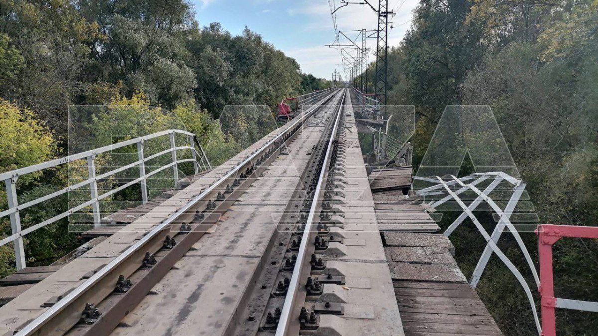 На кадрах хорошо видно, что вдоль путей повреждена металлическая ограда. Кроме того, одна из опор моста и бетонная плита под рельсами пошли трещинами.