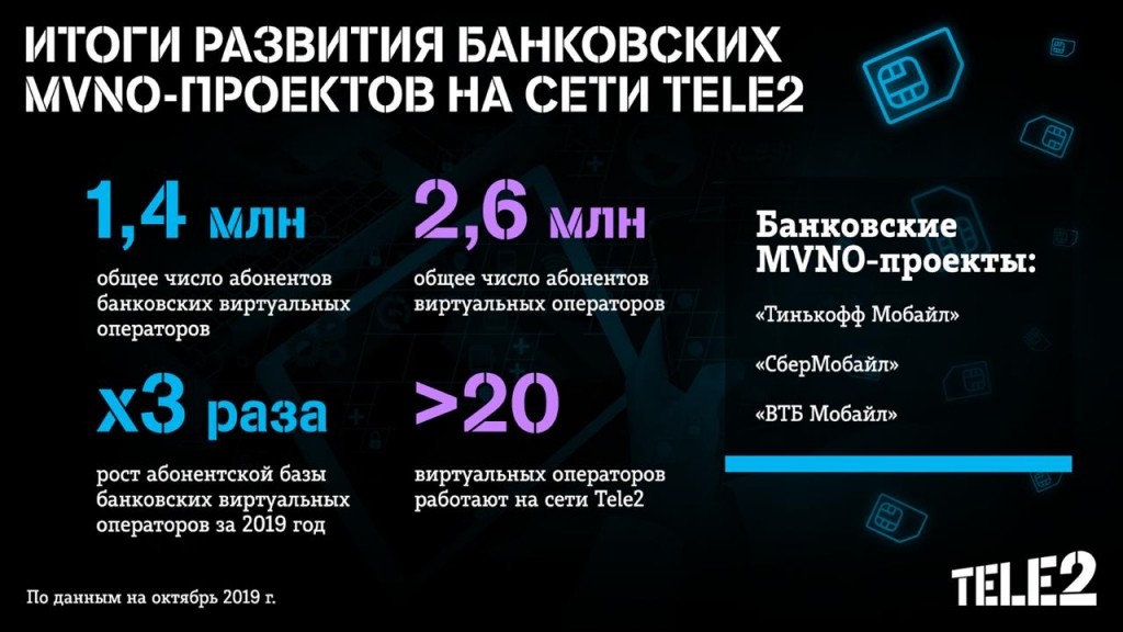 Альтернативный оператор мобильной связи подводит итоги развития банковских MVNO-проектов на сети компании. Абонентская база «Тинькофф Мобайла», «СберМобайла» и «ВТБ Мобайла» по итогам третьего квартала 2019 года составляет 1,4 млн клиентов. На MVNO банков приходится более половины абонентов виртуальных операторов, запущенных на инфраструктуре Tele2.