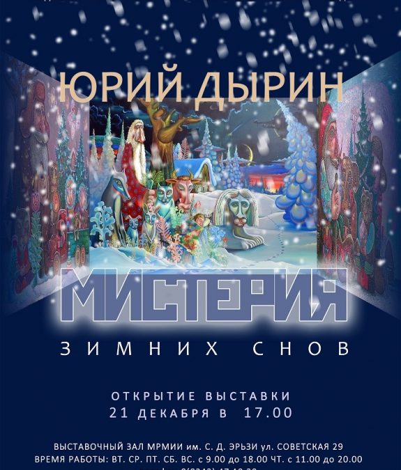 В музее им. Эрьзи состоится открытие «Мистерии зимних снов» — ретроспективной выставки ярчайшего представителя этнофутуризма — вершителя завораживающей мистерии, исполненной искушающей тайны и экзальтированного откровения, художника-демиурга, творящего мифопоэтический образ мира, заслуженного художника Мордовии Юрия Дырина. В экспозиции будет представлено более 70 произведений мастера.
