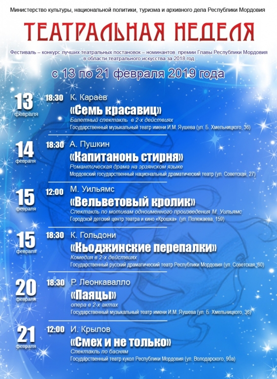 13 февраля в Государственном музыкальном театре им. Яушева состоялось открытие фестиваля-конкурса лучших театральных постановок. Свои работы на суд зрителей представят номинанты премии главы Мордовия в области театрального искусства «Театральная неделя».