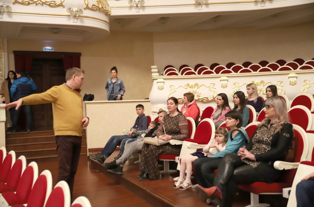Провёл экскурсию руководитель литературно-драматической части театра, доктор искусствоведения Юрий Кондратенко. Он рассказал собравшимся об истории театра. Гости прошлись по этажам великолепного театрального фойе, осмотрели многоярусный зрительный зал, рассчитанный на более, чем 700 мест, познакомились с работой технического оборудования на сцене, побывали в артистических гримёрных, в художественно-декоративном цехе, где изготавливаются декорации для спектаклей, и хореографическом классе, где проходят занятия у артистов балета.