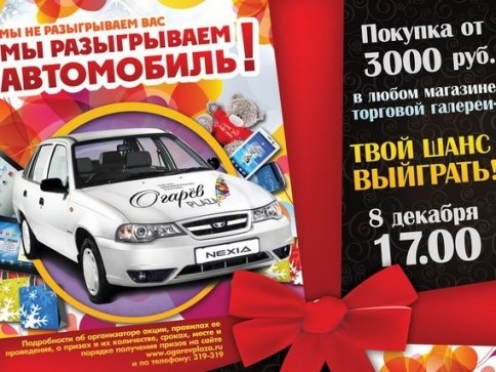 Завтра кто-то из посетителей торгово-развлекательного комплекса уедет домой на новеньком авто «Daewoo Nexia». Шанс обзавестись «на халяву» иномаркой есть у каждого, кто с 12 ноября сделал покупки в любом магазине галереи ТРК «Огарев Plaza» на сумму более 3 тысяч рублей и обменял чеки на купоны, а также заполнил анкету участника акции "Мы разыгрываем автомобиль!».
