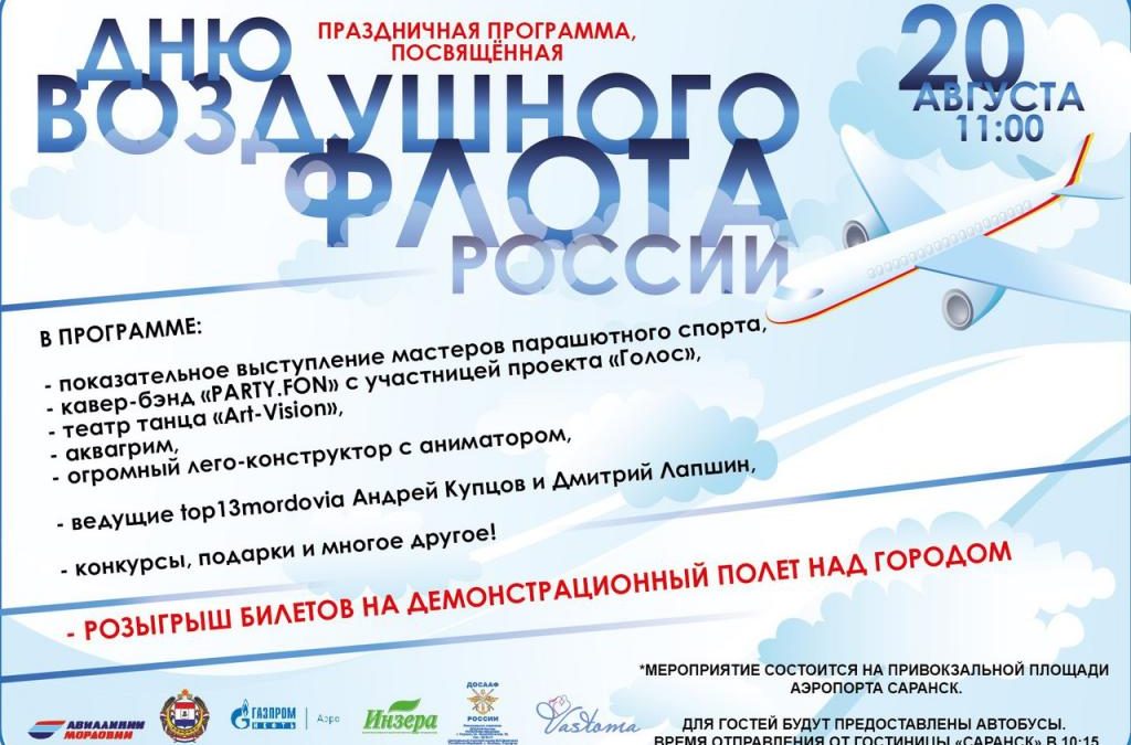 МордовМедиа, 16 августа. В республике с размахом отметят День воздушного флота России. Праздник состоится 20 августа на привокзальной площади саранского аэропорта.