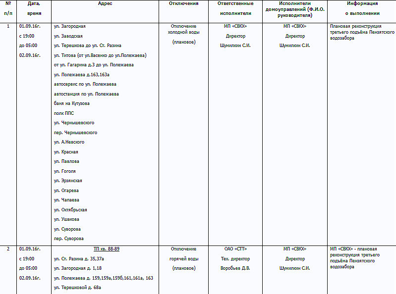 Так, плановое отключение холодной воды произойдёт в домах и организациях на улицах Загородная, Заводская, Титова, Полежаева, Чернышевского, Невского, Красная и др.