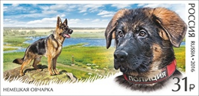 На почтовой марке, посвященной немецкой овчарке, изображен щенок Добрыня, который в декабре 2015 года был передан Министерством внутренних дел Российской Федерации в дар французской полиции. Щенок занял место служебной собаки Дизель, погибшей в ходе спецоперации по нейтрализации террористов в Париже.