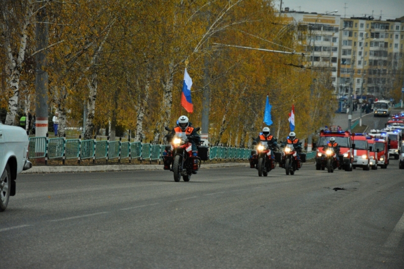 С Советской площади колонна прошла по проспекту Ленина и далее по всем микрорайонам республиканской столицы. В голове автоколонны двинулись пожарно-спасательные мотоциклы «ПСМ F800GS», далее пошли специальные автомобили различных типов: автоцистерны, штабные автомобили и т.д.