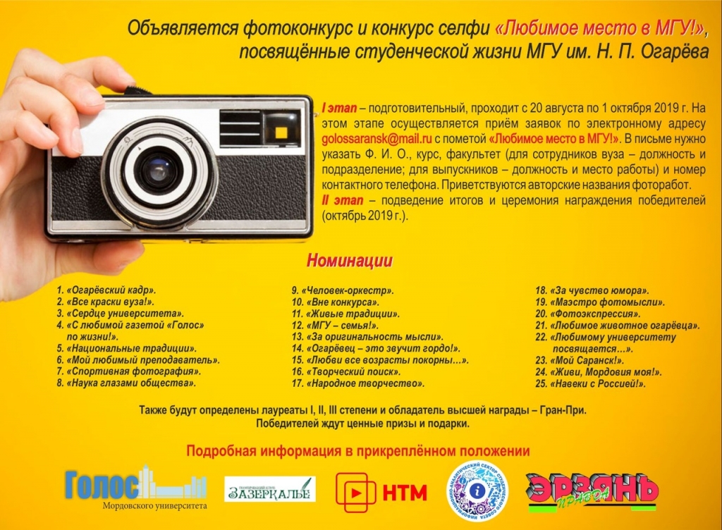 Что касается фотоконкурса, также принимается не более трёх селфи, которые нигде не публиковались. Они должны быть посвящены студенческой жизни мордовского университета.