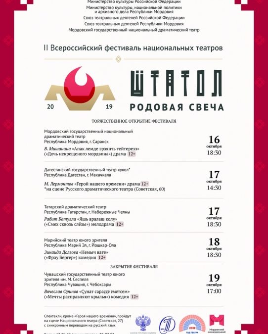 В столице Мордовии пройдёт всероссийский фестиваль национальных театров «Штатол». До этого он проходил лишь однажды — в 2012 году в рамках празднования 1000-летия единения мордовского народа с народами Российского государства. В фестивале примут участие коллективы национальных театров из нескольких регионов. Свои спектакли саранским зрителям они покажут с 16 по 19 октября.