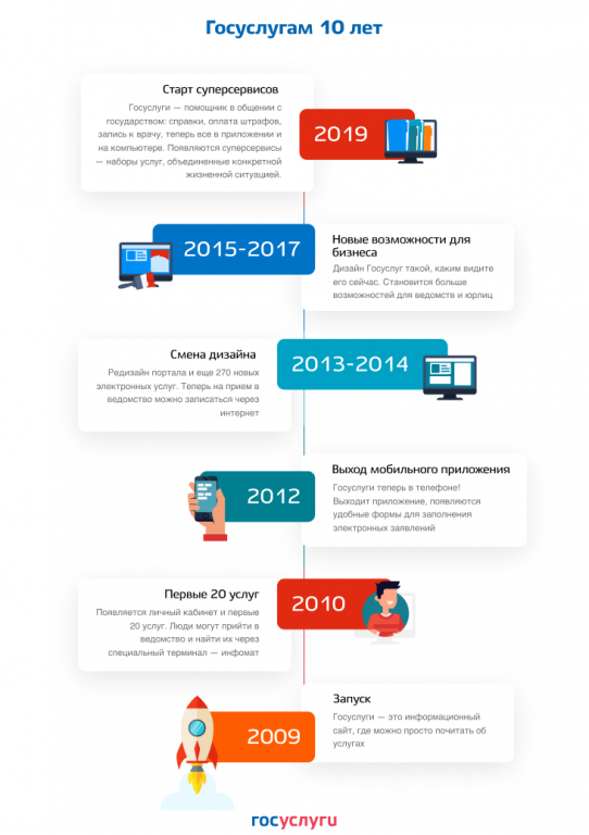 Единому порталу госуслуг исполнилось 10 лет. 15 декабря 2009 года, в день официального открытия, на портале была размещена информация о 110 услугах федерального и более 200 — регионального и муниципального уровней. Сегодня на портале госуслуг доступно свыше 29 тыс. сервисов в электронном виде.