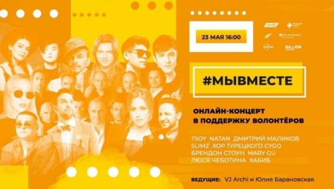 В субботу, 23 мая, состоится онлайн-концерт в поддержку волонтёров акции #МыВместе. В программе мероприятия – выступления Хора Турецкого, TSOY, Дмитрия Маликова, NATAN, Люси Чеботиной, Брендона Стоуна, Сygo, Хабиба, Mary Gu, Slimz. Ведущими онлайн-события будут VJ Archi и Юлия Барановская.