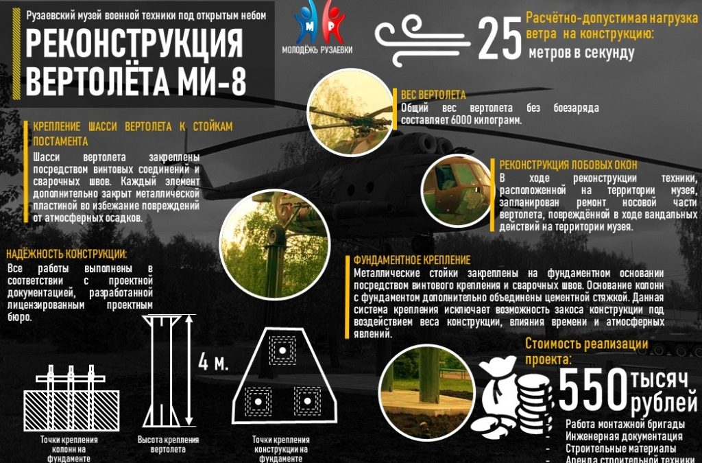 На вертолёт не раз покушались вандалы, поэтому было принято решение поднять героя афганского конфликта на постамент. Как сообщает паблик «Молодёжь Рузаевки», все работы по подъёму вертолёта завершены. Местные жители уже задались вопросом: безопасна ли конструкция? В Центре молодежной политики и туризма Рузаевского района и молодежной общественной организации «Рост» сообщают, что работы проведены в соответствии с проектной документацией, разработанной лицензированным проектным бюро. Так, шасси вертолёта закреплены посредством винтовых соединений и сварочных швов.