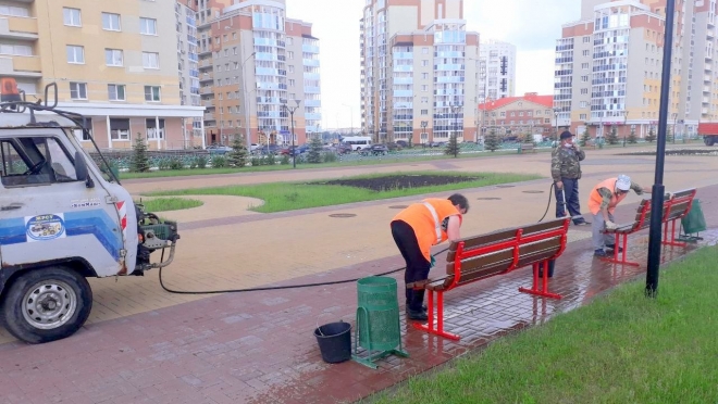 Хлорсодержащим раствором обработали бульвары братьев Веденяпиных и Цаплина, площади по улице Коваленко и в районе храма Казанской иконы Божьей Матери. Скамейки и урны продезинфицировали на бульваре М. Расковой, на проспекте Российской Армии и аллее Связистов.