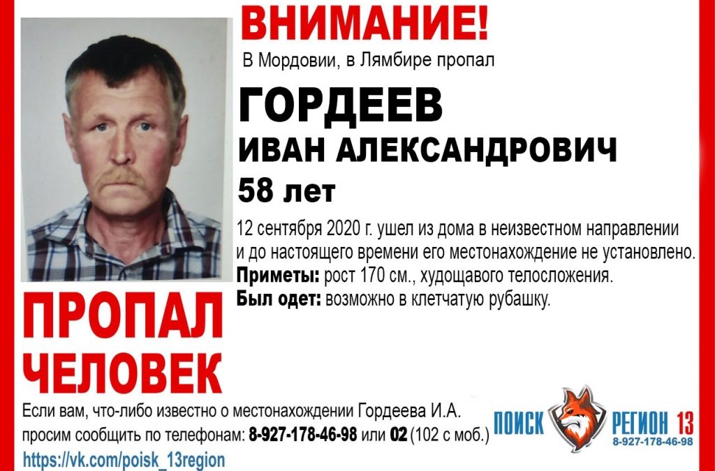 В Мордовии разыскивают Гордеева Ивана Александровича 58 лет. Он пропал в Лямбире 12 сентября, ушёл из дома и не вернулся.