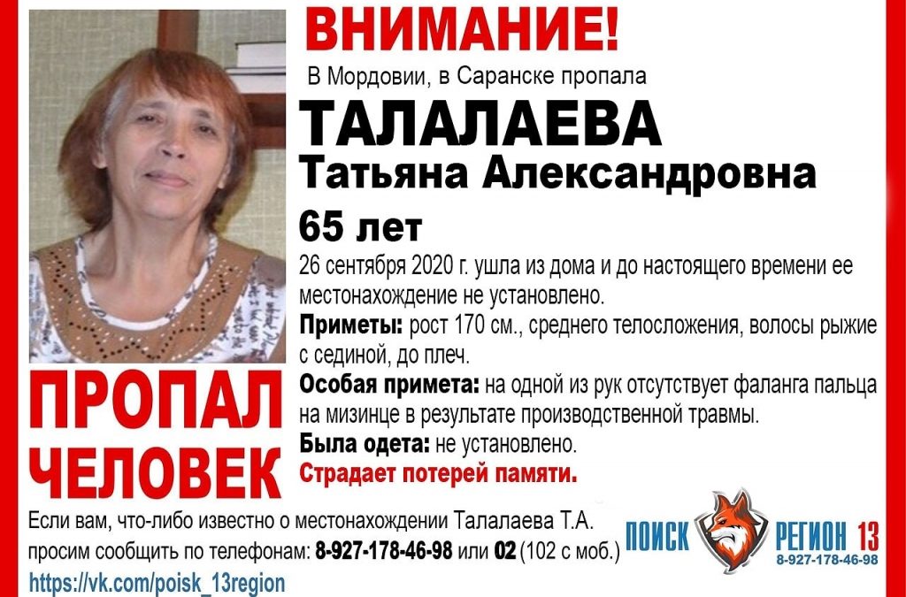 Татьяну Талалаеву 65-ти лет ищут с 26 сентября. Женщина страдает потерей памяти. Сообщать о наличии видеозаписей просят по телефону 8-927-178-46-98.