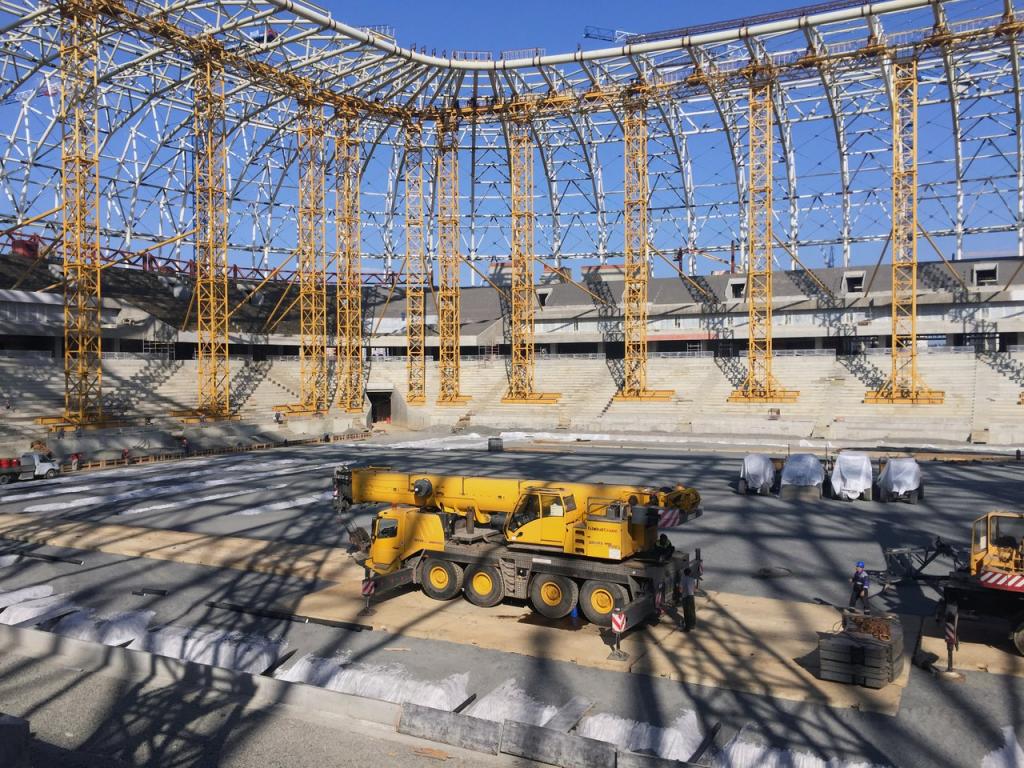 Сейчас, когда крыша арены готова и её опорные конструкции заняли проектное положение, временные поддерживающие конструкции можно и нужно убирать. Их общий вес — около 1400 тонн. Демонтаж займёт 2-3 недели.
