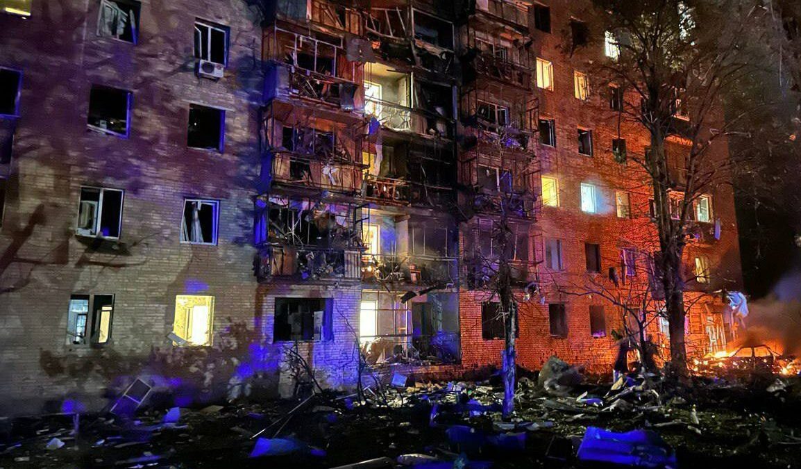 В 9-этажном жилом доме выбиты окна, повреждены балконы. Несущие конструкции здания, к счастью, остались целы, благодаря чему удалось избежать обрушения.