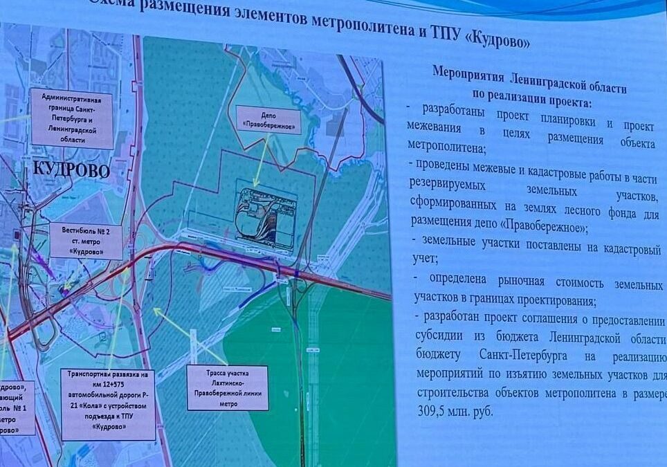 «На встрече обсуждались транспортные проекты, которые необходимо реализовать в регионе. Было принято решение о подписании до конца 2024 года договора о проектировании метро в Кудрово. Кроме того, было принято решение о федеральном софинансировании строительства станции метро «Кудрово» и электродепо», – говорится в публикации.