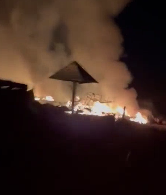 На кадрах видны остатки палаток и горящие двухъярусные кровати, которые обычно ставят для солдат в казармах.
