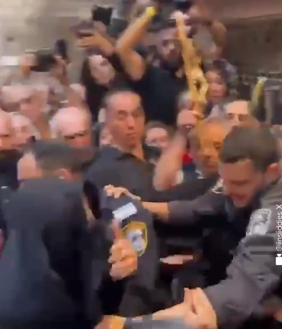 В сети даже появилось бодрое видео, на котором трое дюжих израильтян в полицейской форме выхватывают из толпы и тащат к выходу мужчину, которому напялили на голову пиджак.
