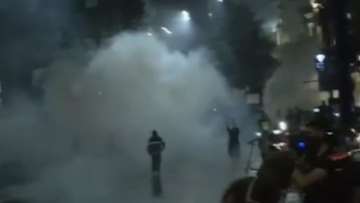 Также началась стрельба из ракетниц по демонстрантам. Протестующие в ответ швыряют камни и бутылки в полицейских.